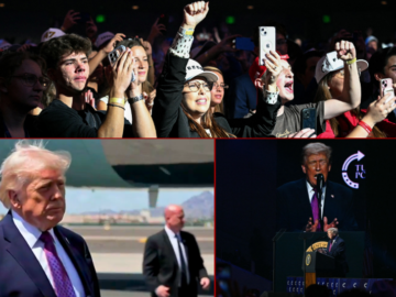 (top) Attendees cheer during TPUSA event on April 17, 2026. (Photo by Jim WATSON / AFP via Getty Images) / (L-bottom) President Trump on April...