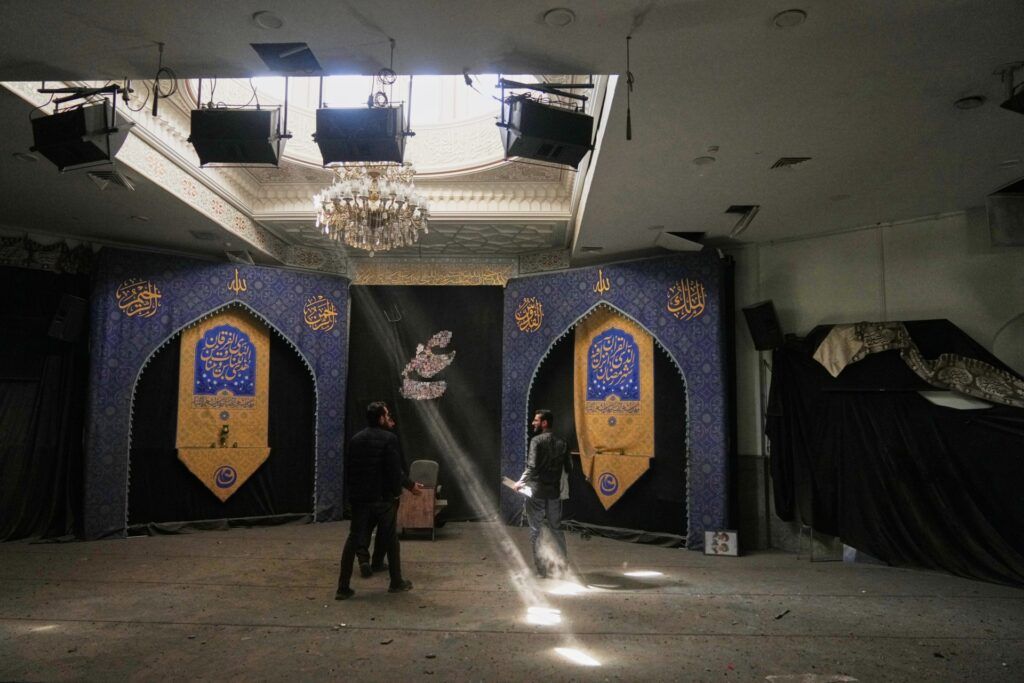 Students inspect damage at a mosque at Tehran’s Sharif University of Technology complex that Iranian authorities say was hit early morning by a U.S.-Israeli strike, in Tehran, Iran, Monday, April 6, 2026. (AP Photo/Francisco Seco)