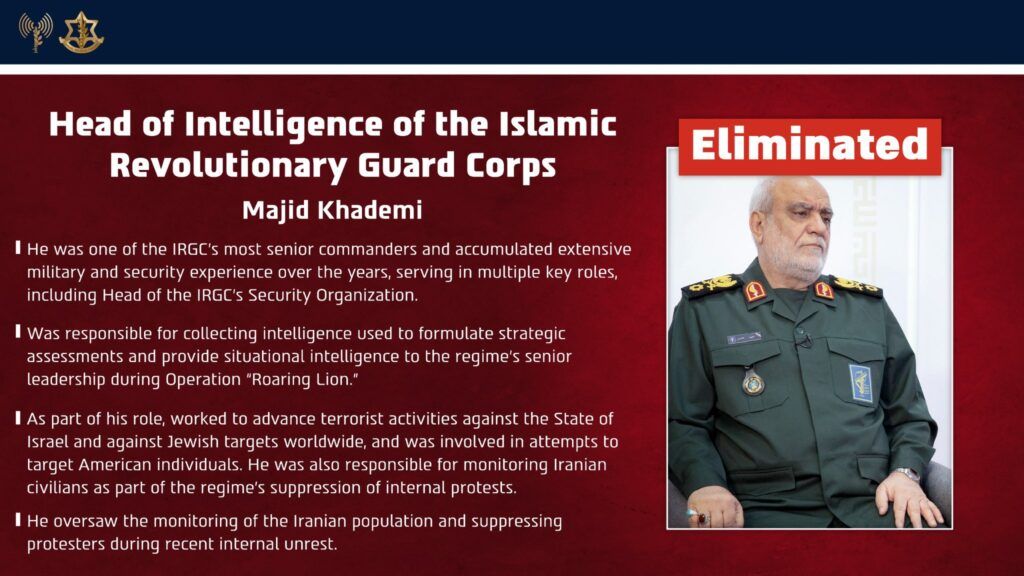 The head of the Islamic Revolutionary Guard Corps (IRGC) intelligence organisation in Iran, Majid Khademi, was killed Monday in a targeted Israeli air strike.